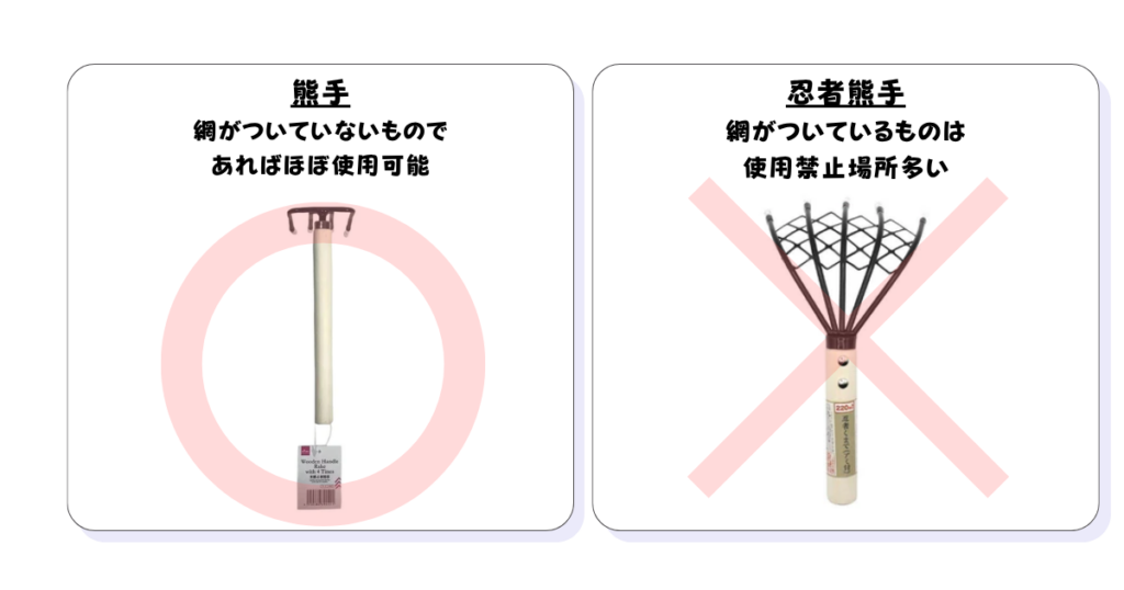 ダイソーには「熊手(110円)」と「忍者くまで(220円)」の2種類があります。忍者くまでは禁止の場所が多いので普通のくまでを選ぶようにしてください。